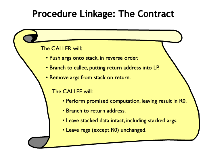 * Perform the promised computation, leaving the result in R0. * Jump to the return address when the computation has finished * Remove any items it has placed on the stack, leaving the stack as it was when the procedure was entered. Note that the arguments were PUSHed on the stack by the caller, so it will be up to the caller to remove them. * Preserve the values in all registers except R0, which holds the return value. So the caller can assume any values placed in registers before a nested call will be there when the nested call returns.
